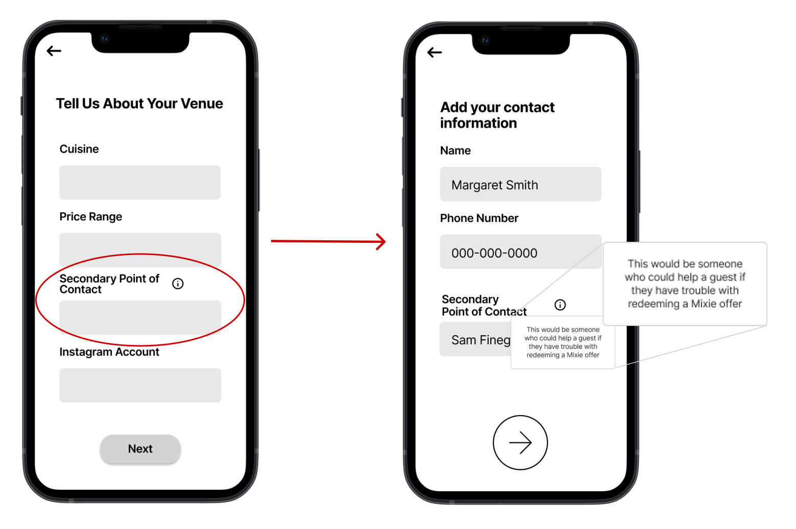 To address the confusion around “What is a 2nd Point of Contact?” from concept testing, we decided to move the field from the “Tell us about your restaurant” screen to an earlier contact information screen to keep similar items together.