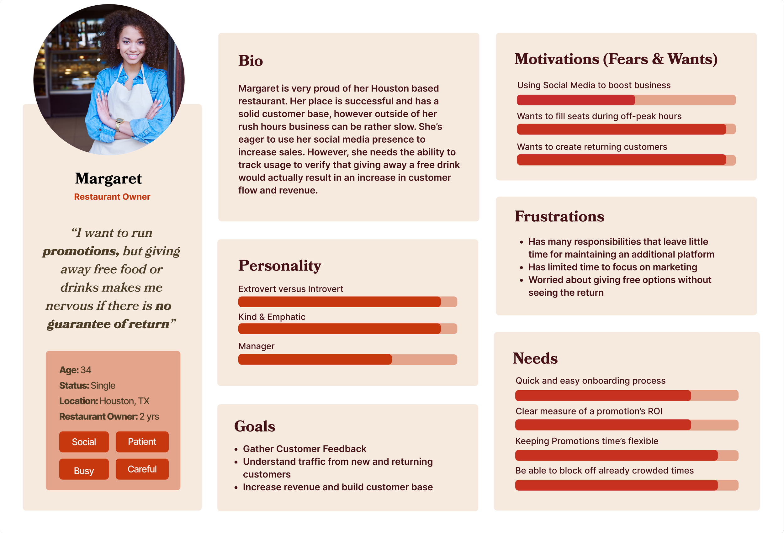 With these things in mind, we created our persona, Margaret, a restaurant owner in Houston, TX